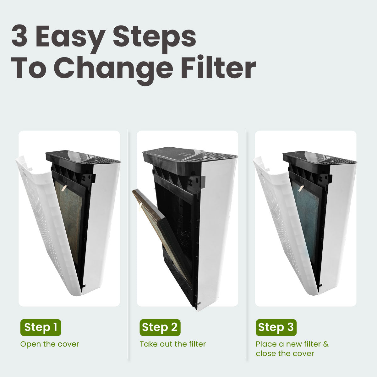 - Effortless filter replacement - Changing the filter of this air purifier is a simple process that can be completed in just three easy steps: open the device, remove the old filter, and insert the new one, allowing you to maintain clean air in your home with minimal effort.