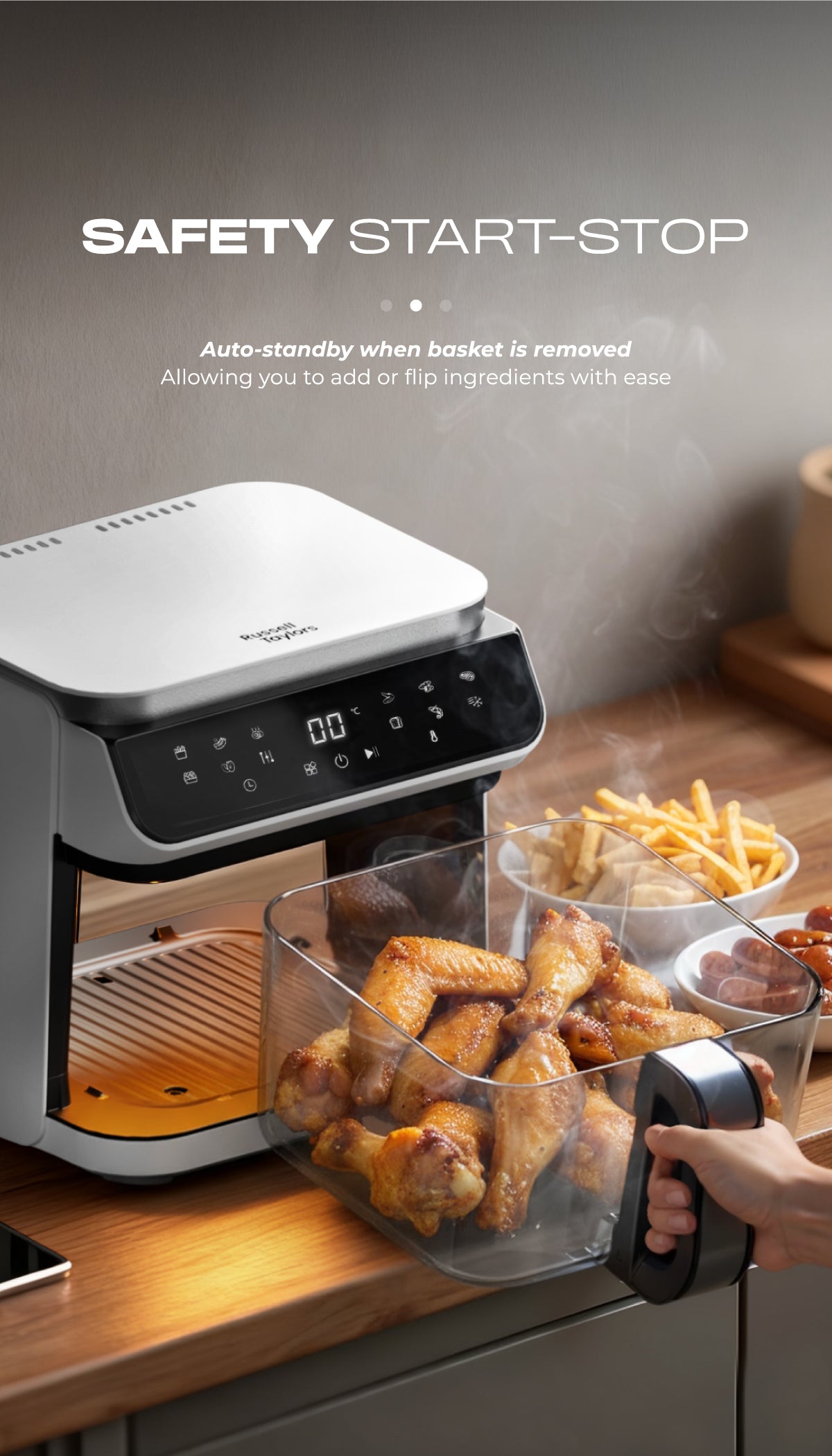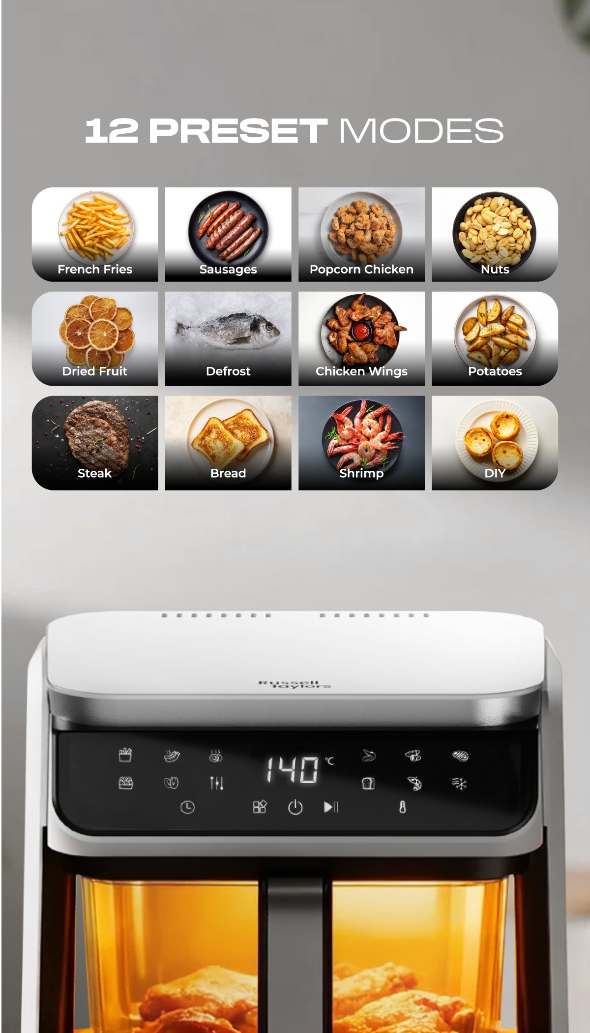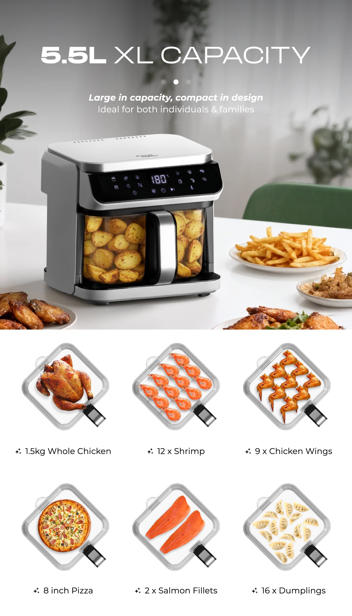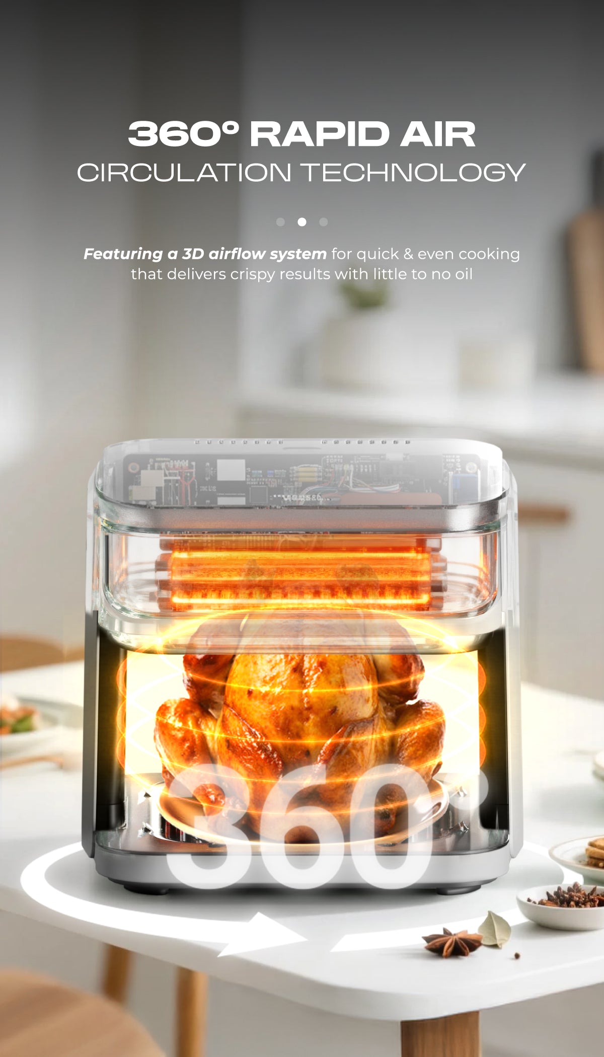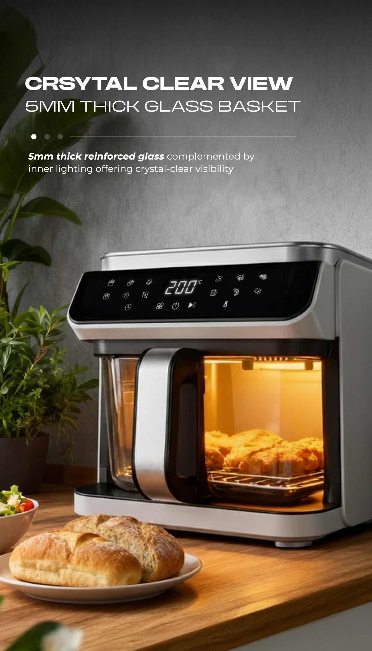 - Crystal Clear View: Check on your food anytime with just a glance through the glass basket from all angles, enhanced by an interior coil-lighting design