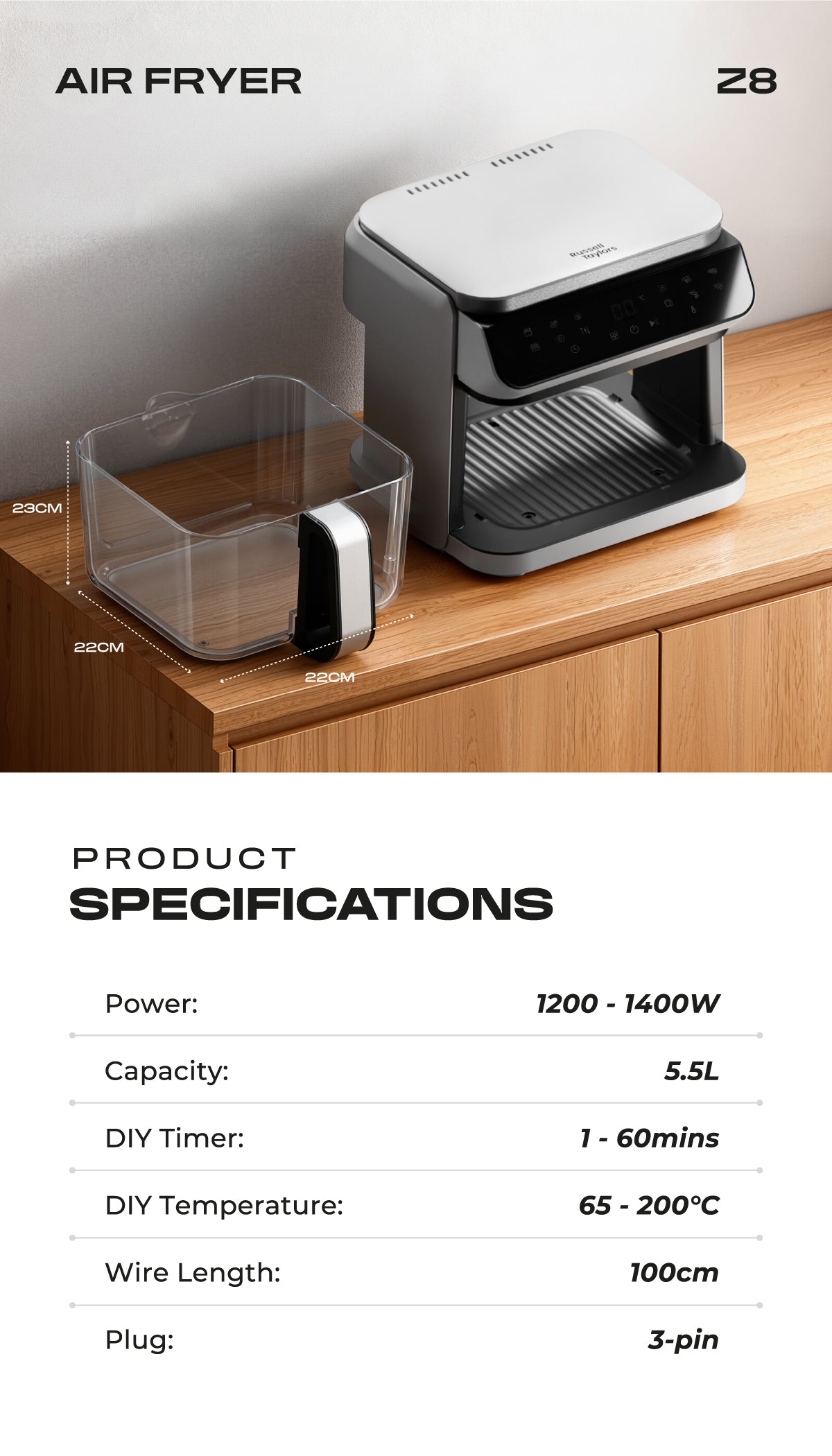 - 1400W of unmatched heating efficiency delivering fast, even cooking with little to no oil. Achieve crispy, golden results while enjoying healthier meals