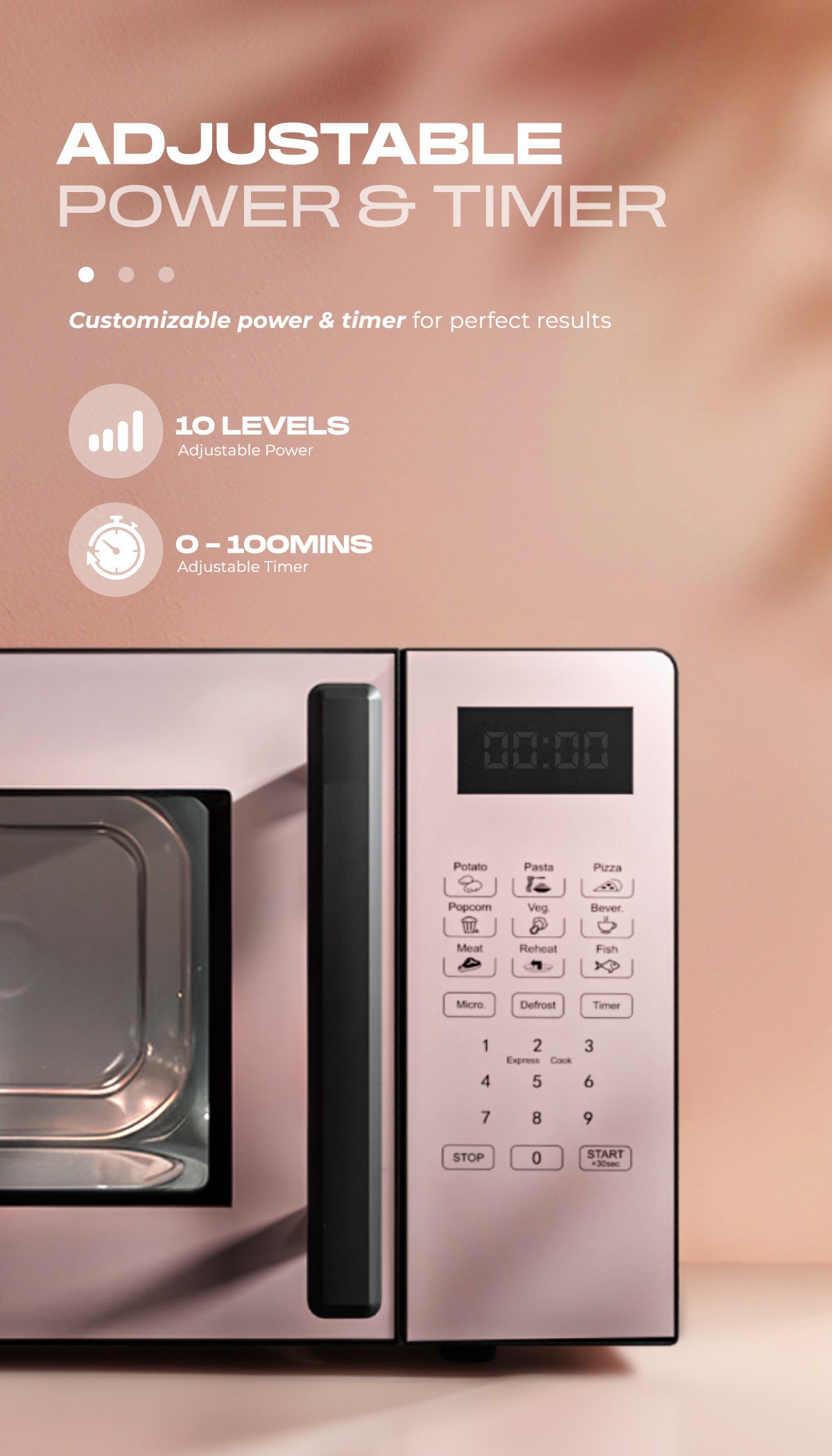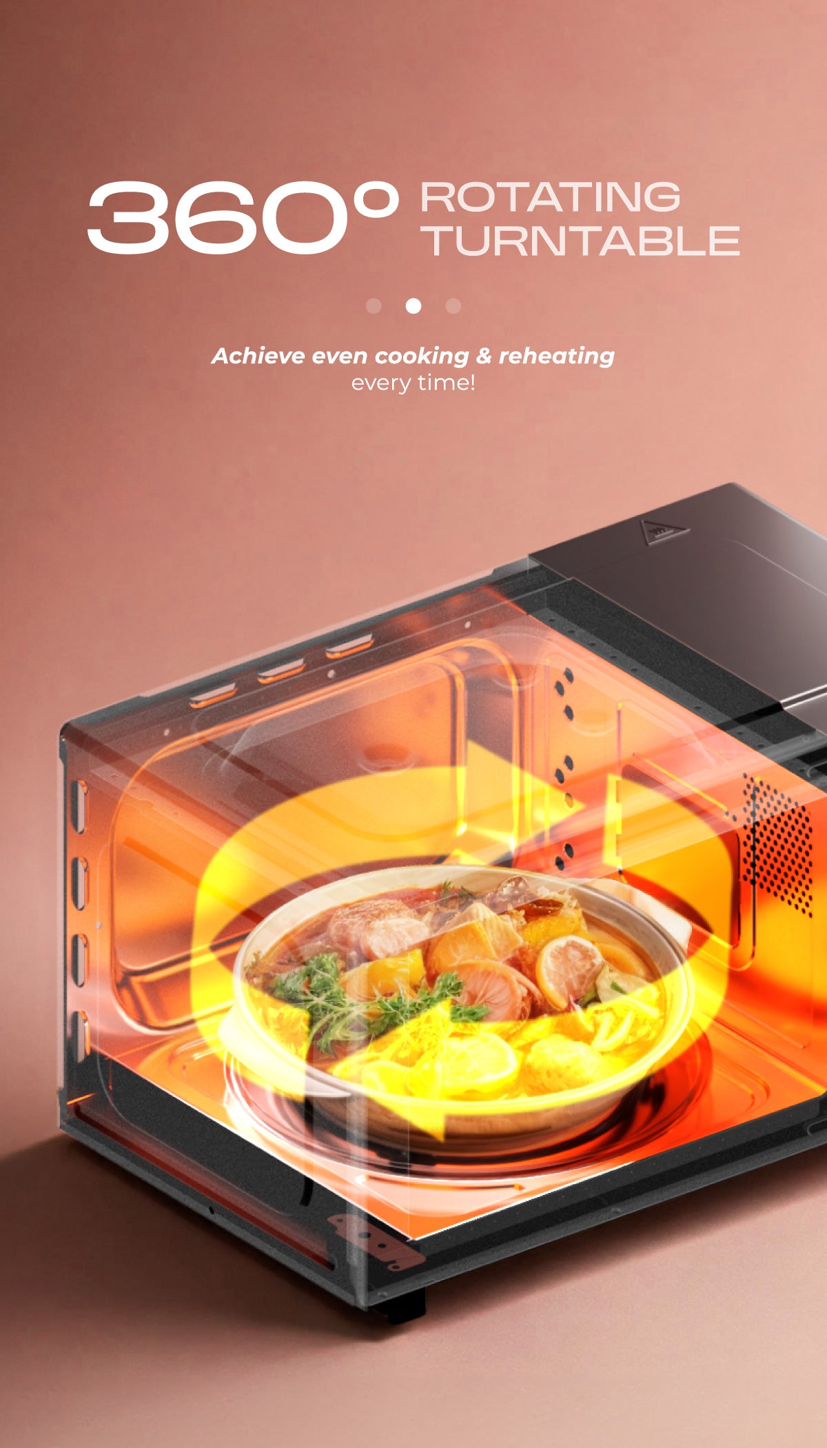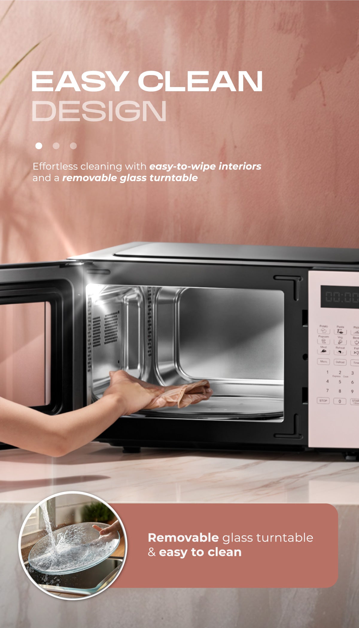 - 850W power with a glass turntable ensures fast, even heating. The rotating tray helps food cook evenly for reliable daily performance.