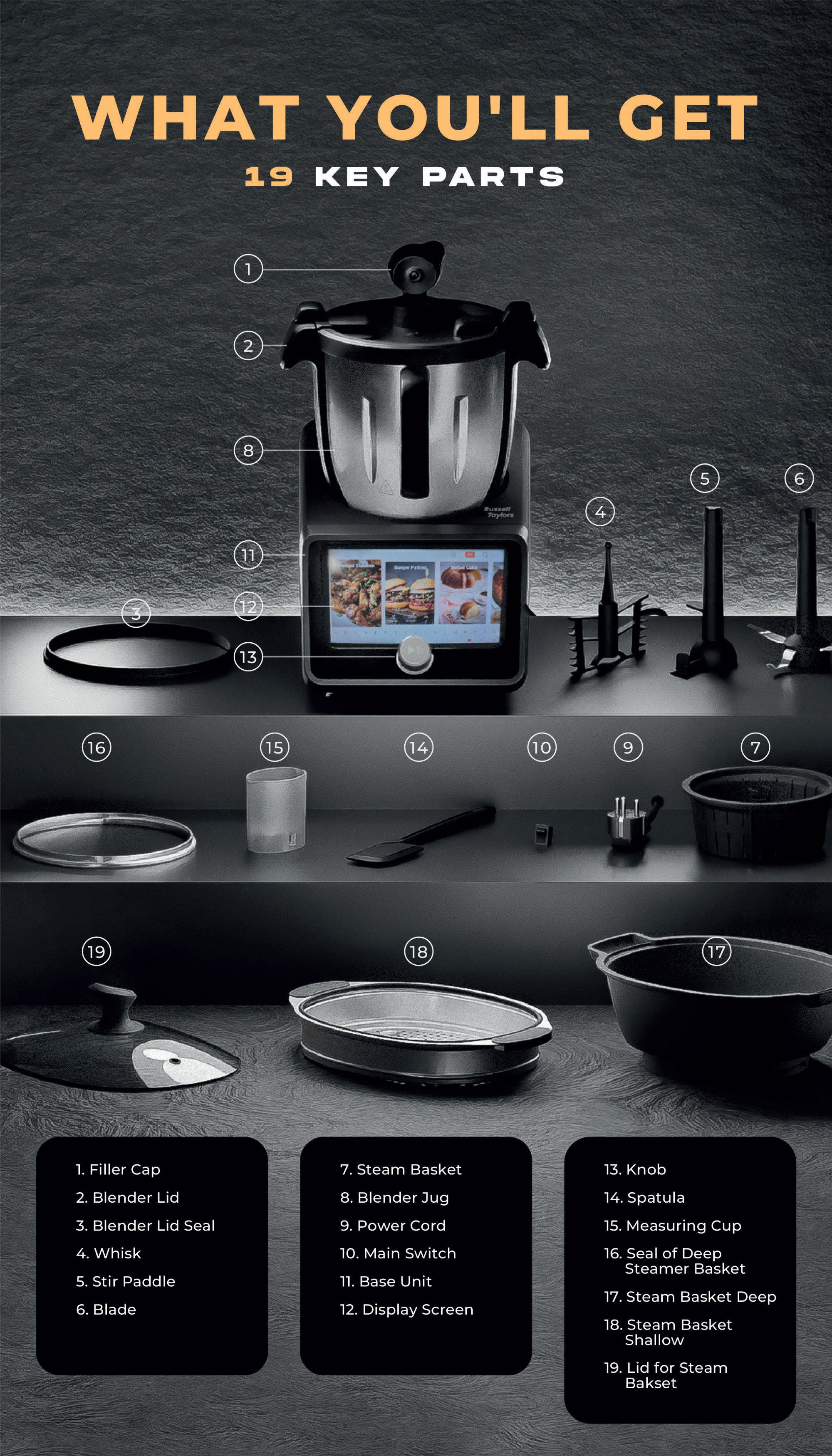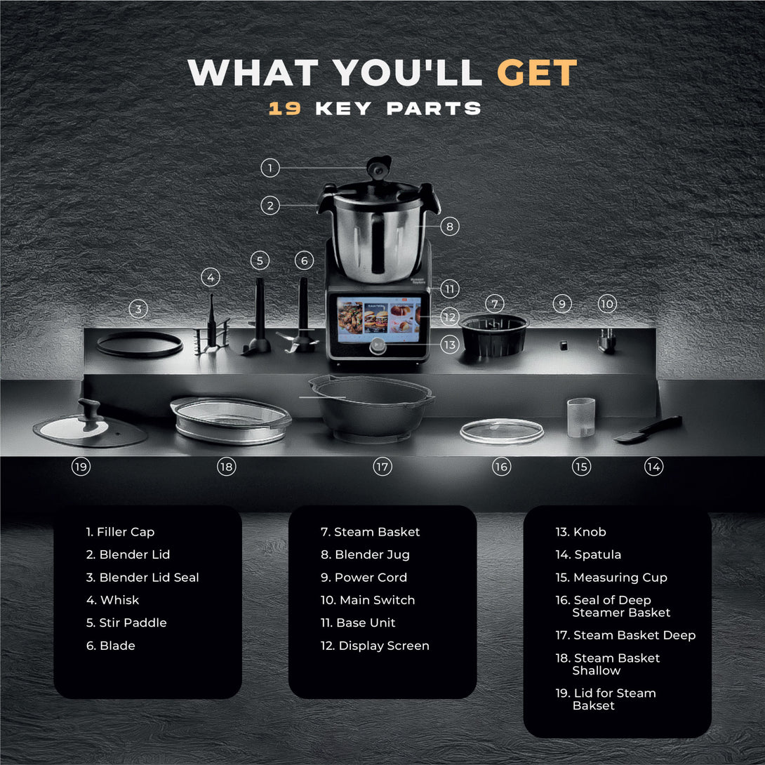 - All in one kitchen marvel that prepares your meals efficiently, faster, and more exciting than ever before! Featuring a 7-inch touch screen display and step-by-step digital recipes complemented by an automated cooking process