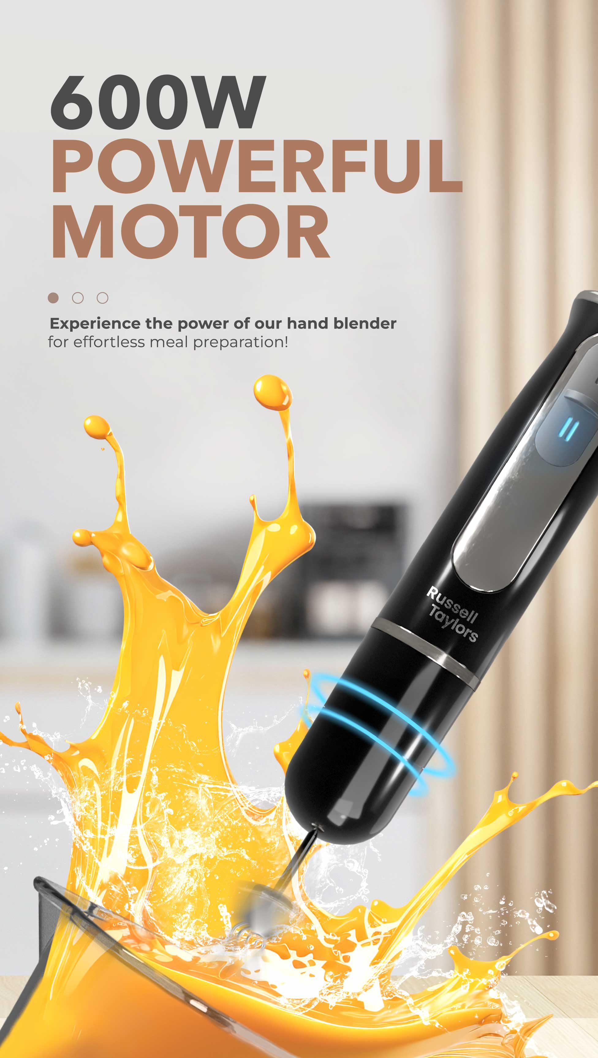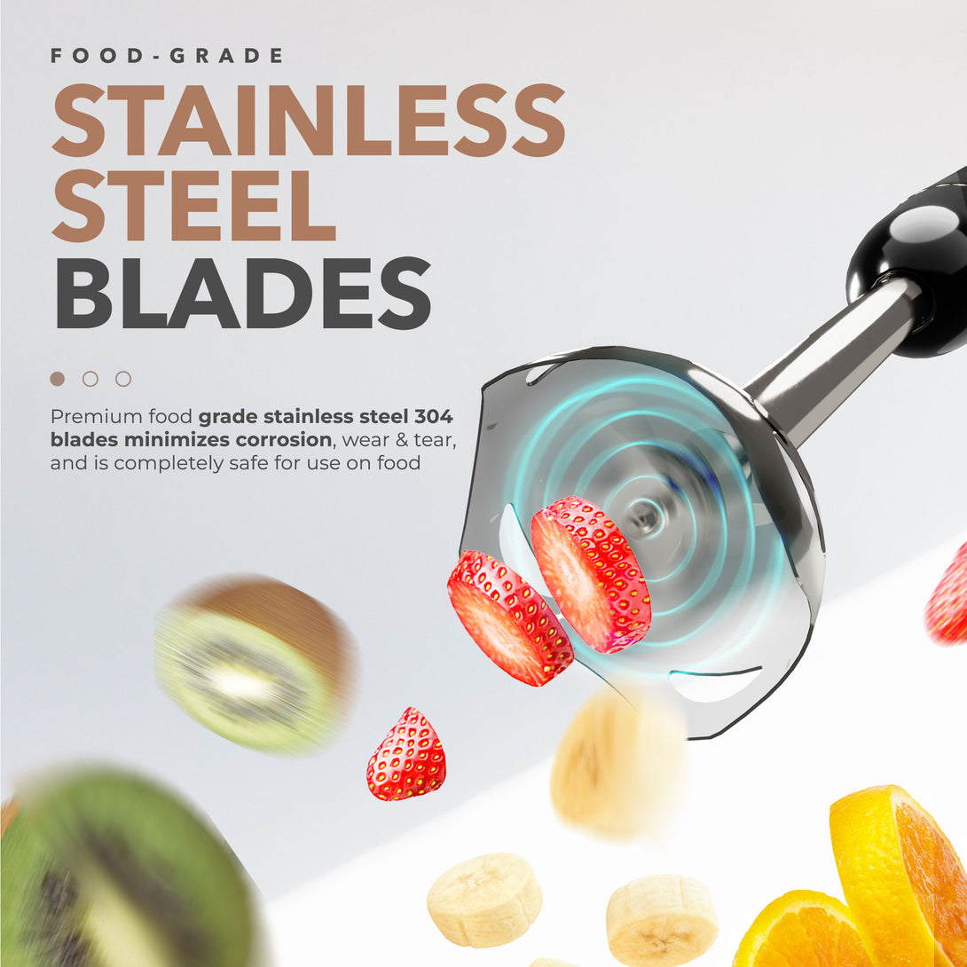 - With its powerful 600W motor and dual speed control, this hand blender can tackle anything from soups to smoothies, making it the ultimate kitchen multitasker. And with the included stainless steel blade, chopper bowl, jar, and whisk, you'll have everything you need to whip up a feast in no time.