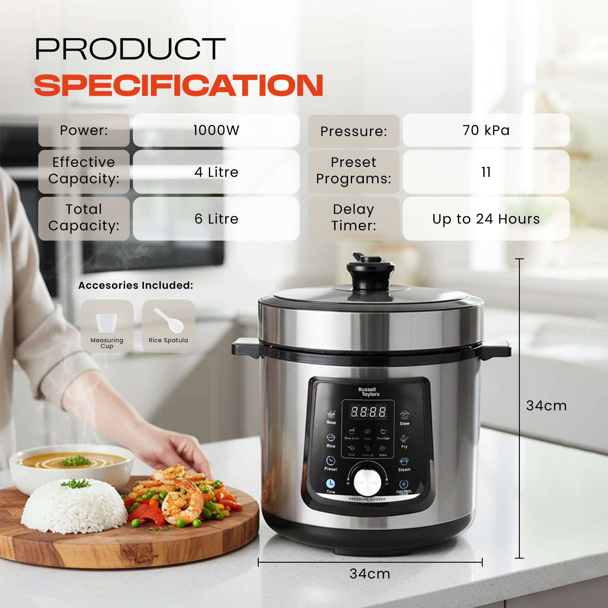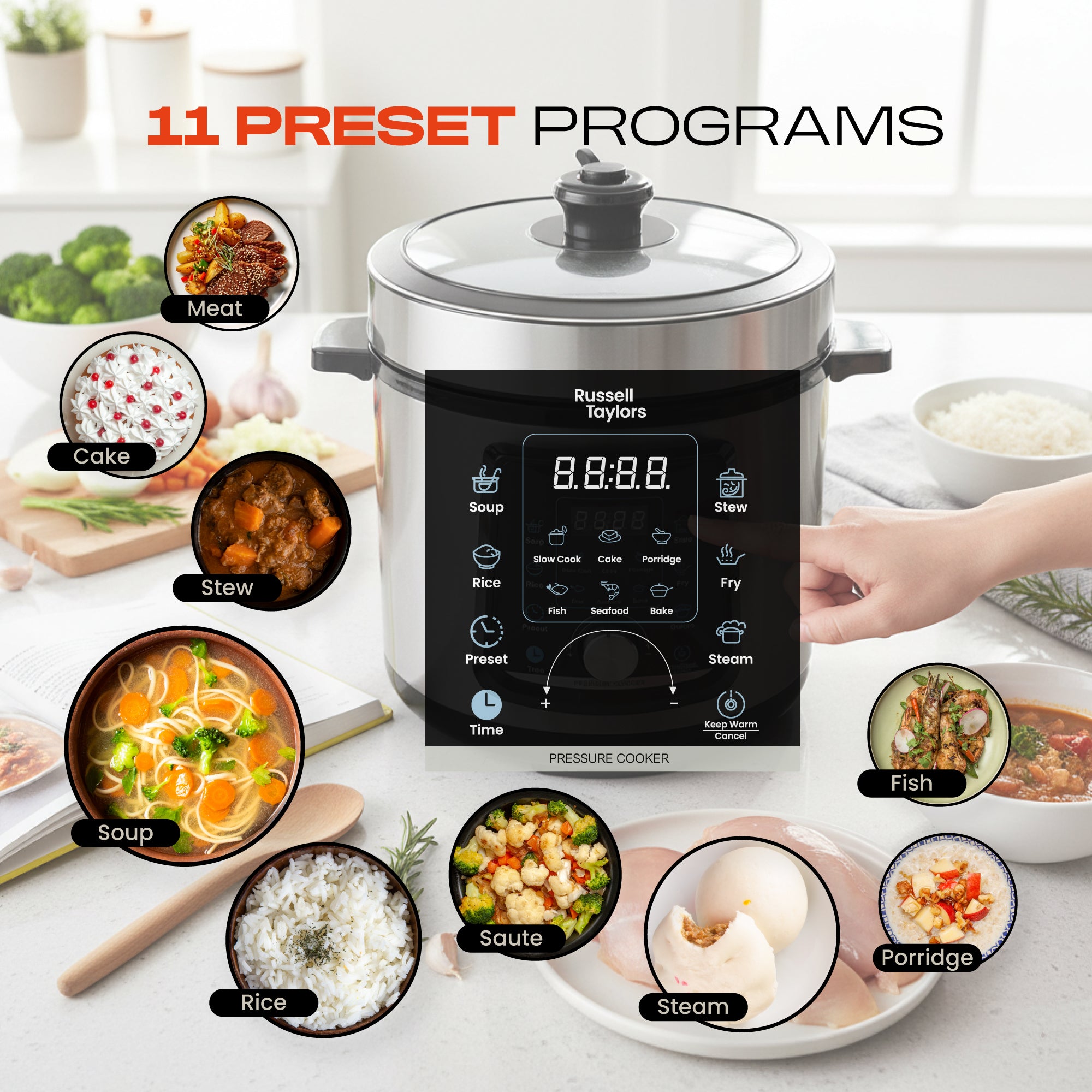 - 11 PRESET PROGRAMS - Soup, Rice, Slow Cooking, Cake, Porridge, Fish, Seafood, Bake, Stew, Fry and Steam. It's now as simple as pressing a button to prepare your favorite dishes