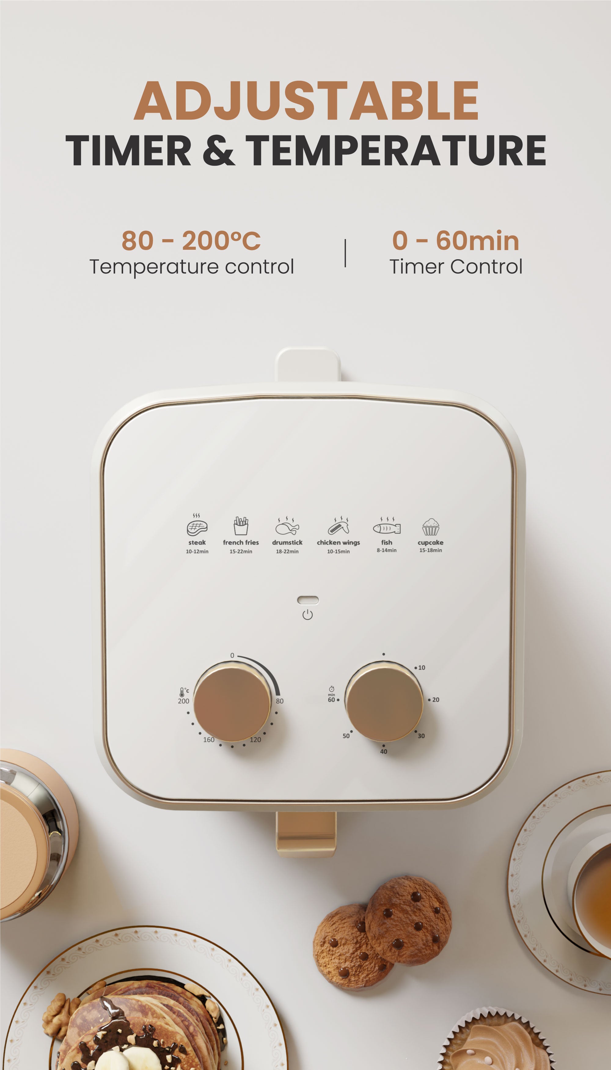 - TEMPERATURE CONTROL: preset cooking temperatures of up to 200 C