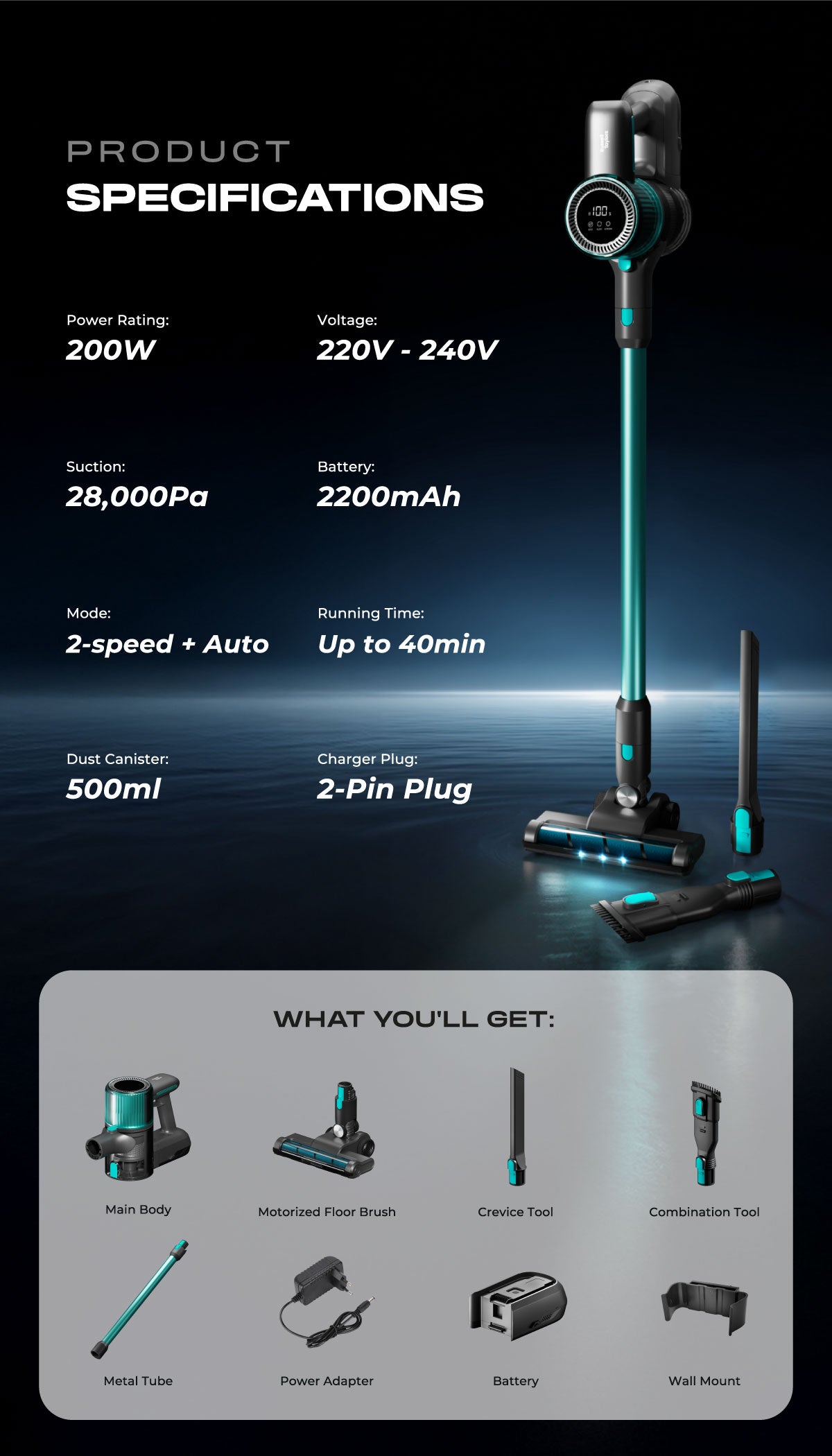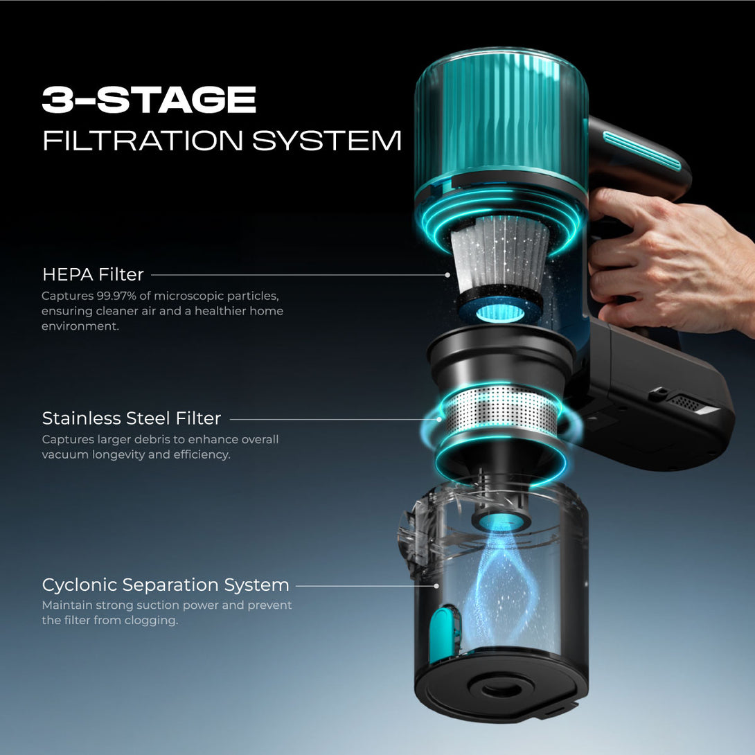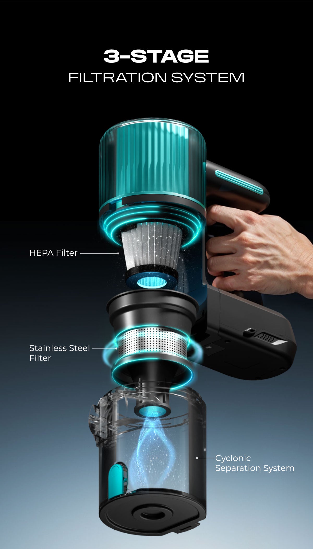 - All-new CYCLONE TECHNOLOGY and HEPA Filter simultaneously operating to eliminate up to 99% microscopic dust particles