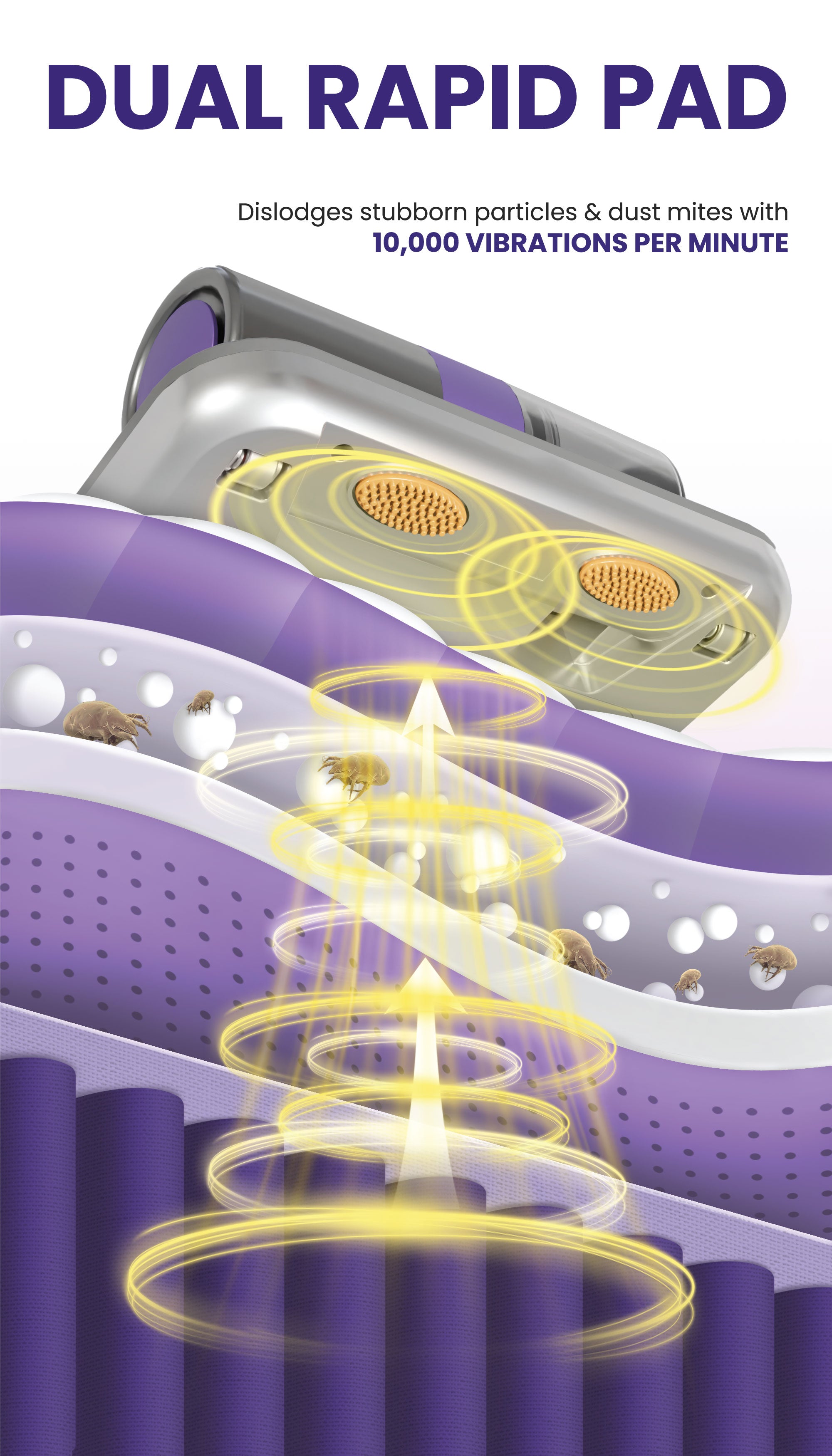 - RAPID BEATING TECH - Pulsating pads vibrate 10,000 times per minute to agitate and loosen dirt and dust mite matter