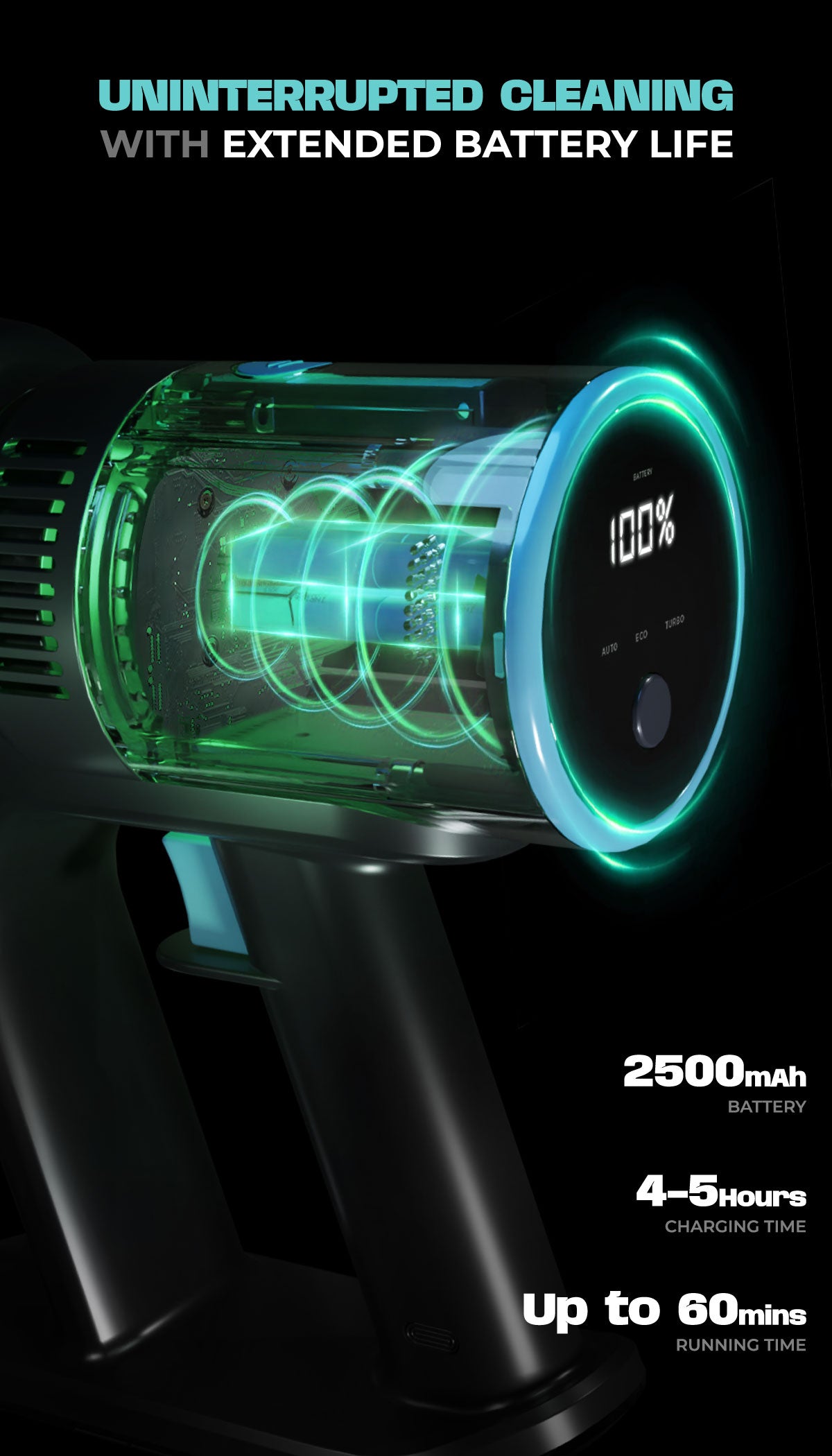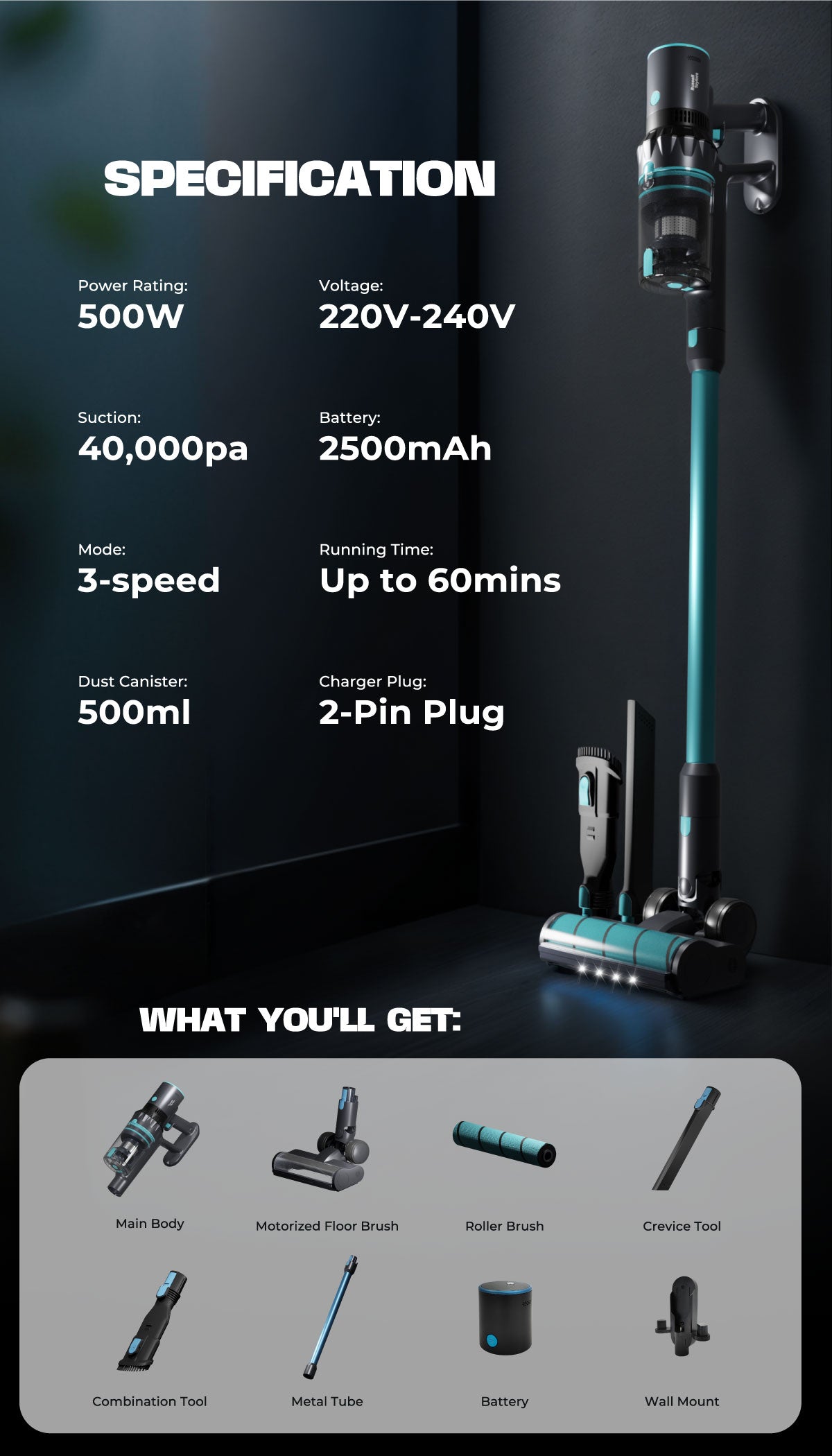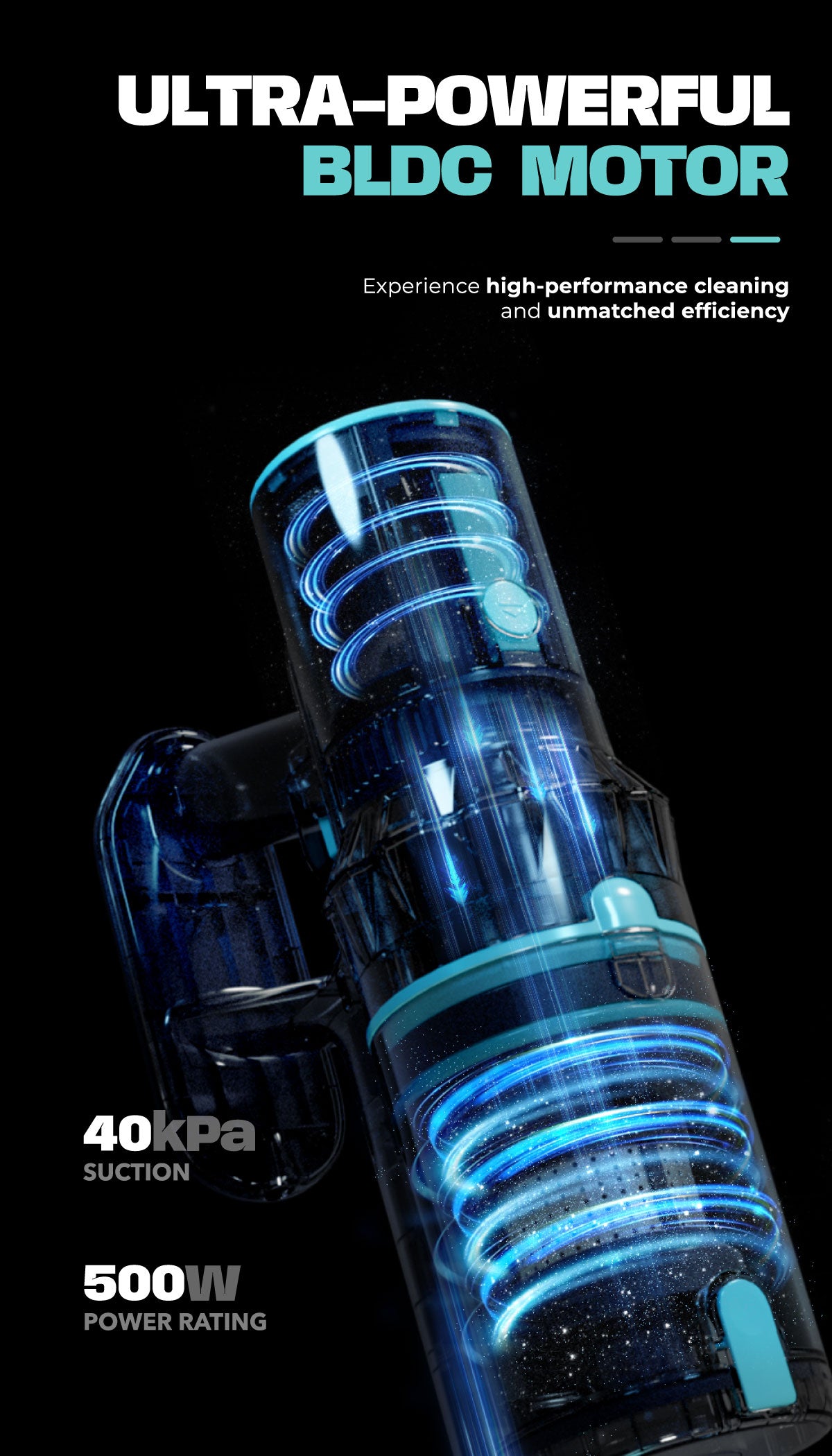 - POWERFUL 500W BLDC brushless motor providing 40kPa of suction power on MAX mode, effortlessly capturing debris, dust and any unwanted foreign material