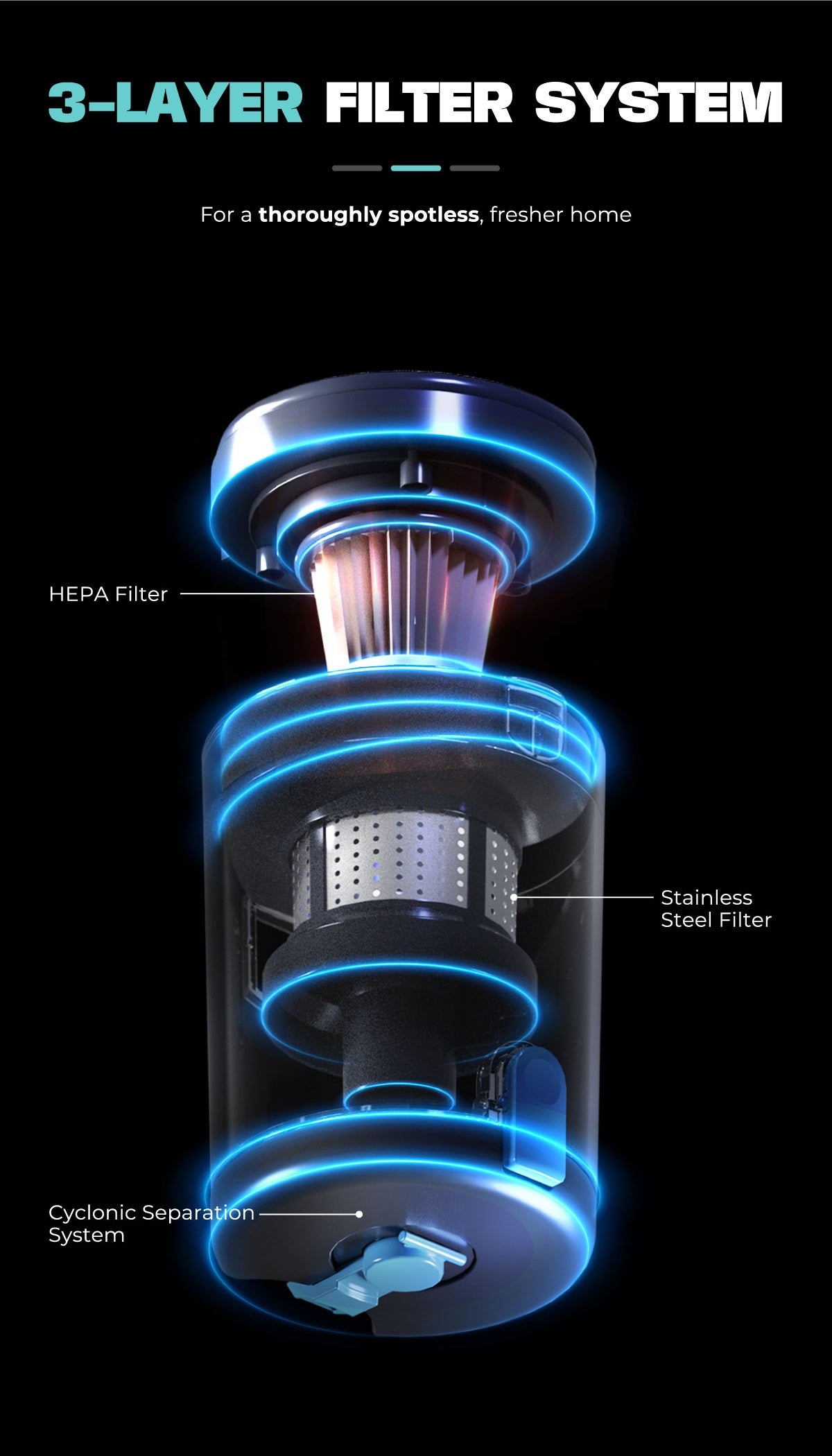 - All-new CYCLONE TECHNOLOGY and HEPA Filter simultaneously operating to eliminate up to 99% microscopic dust particles